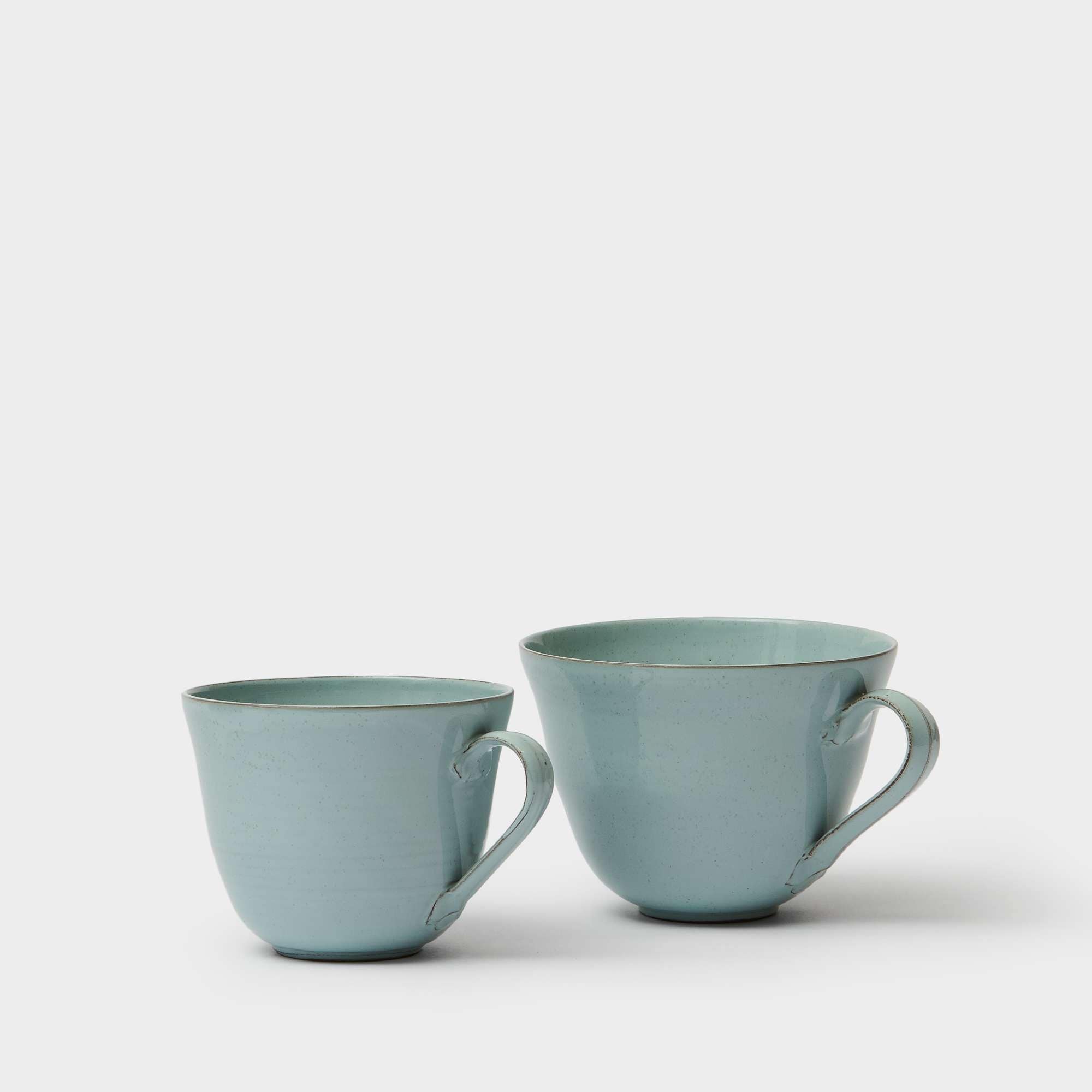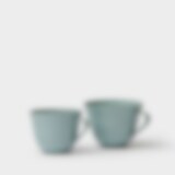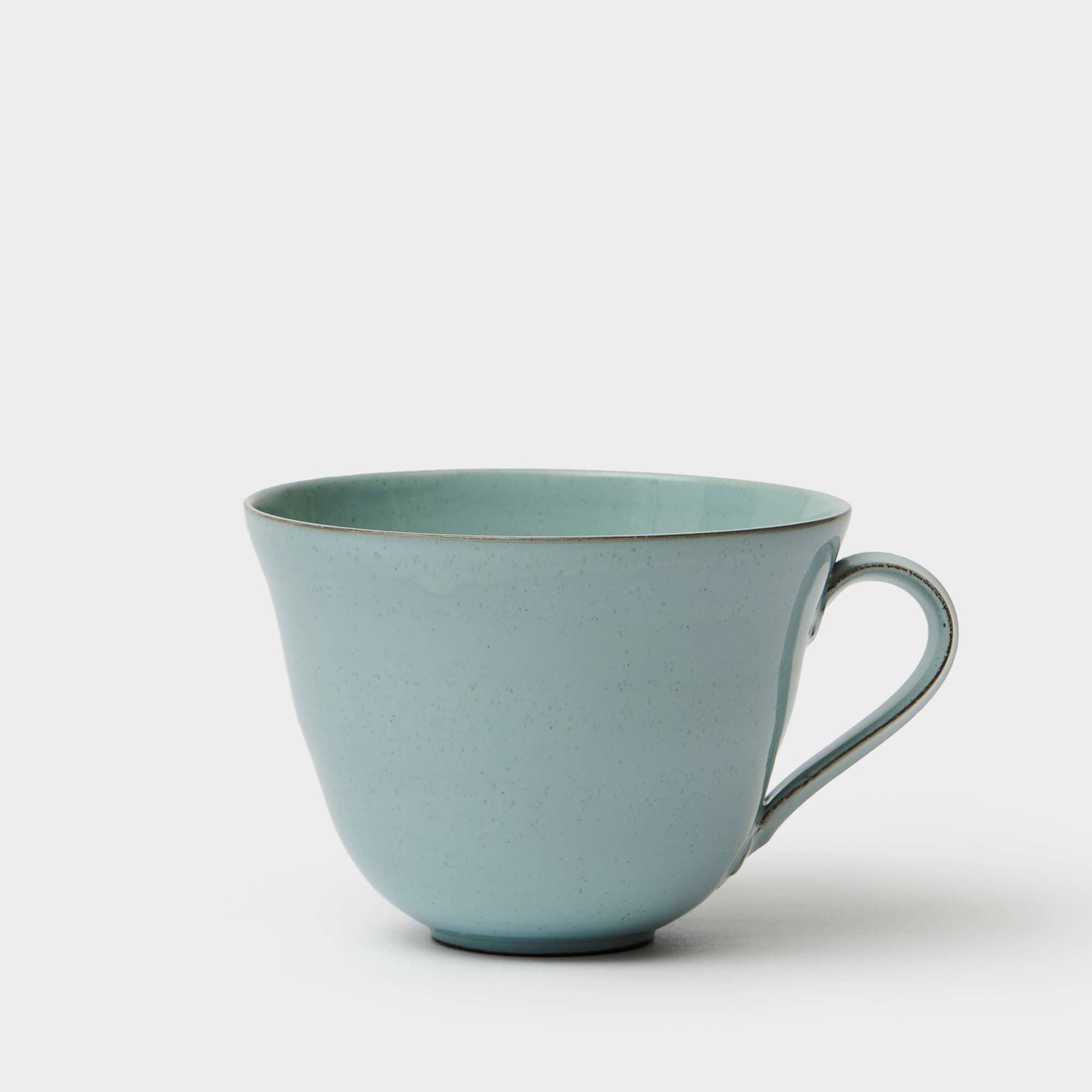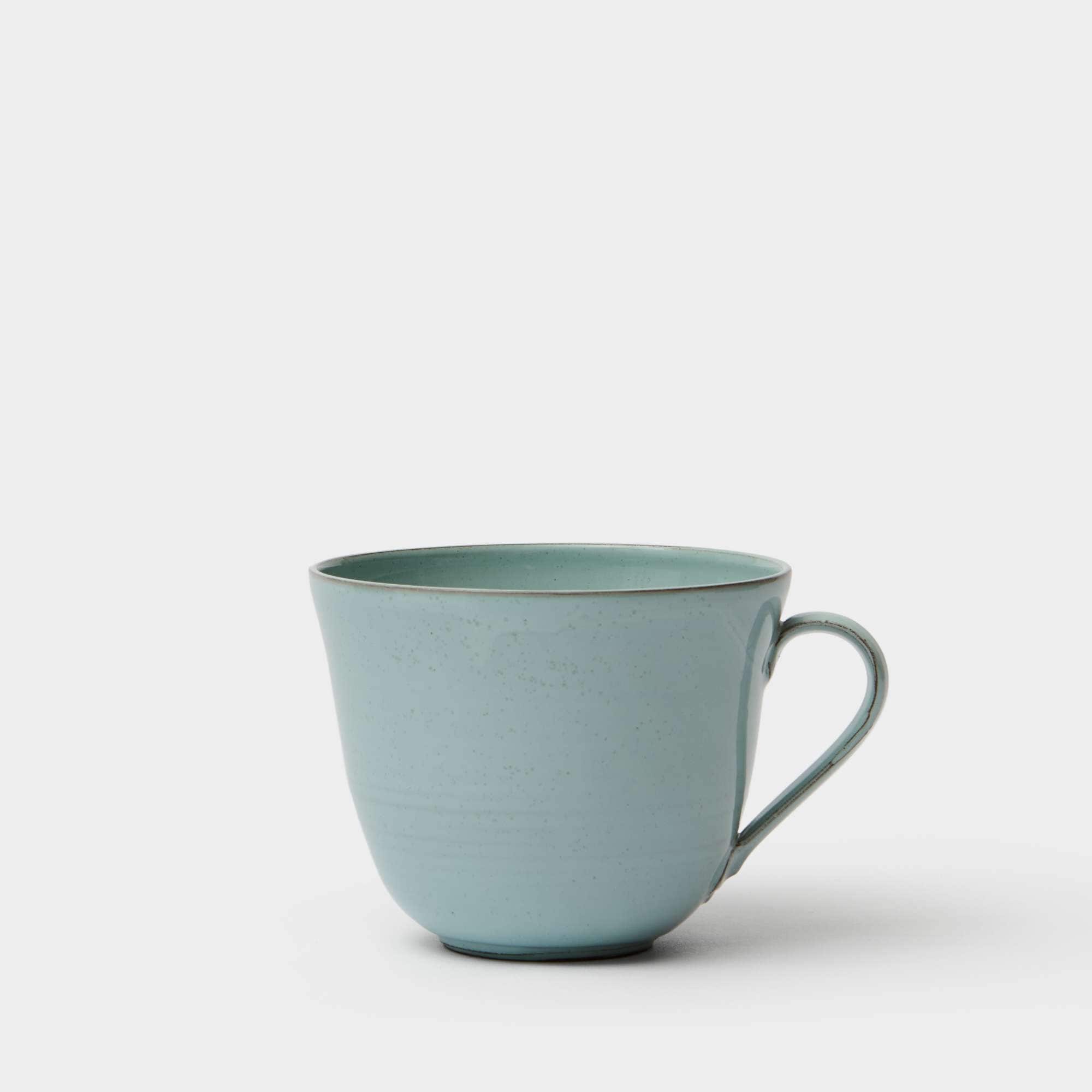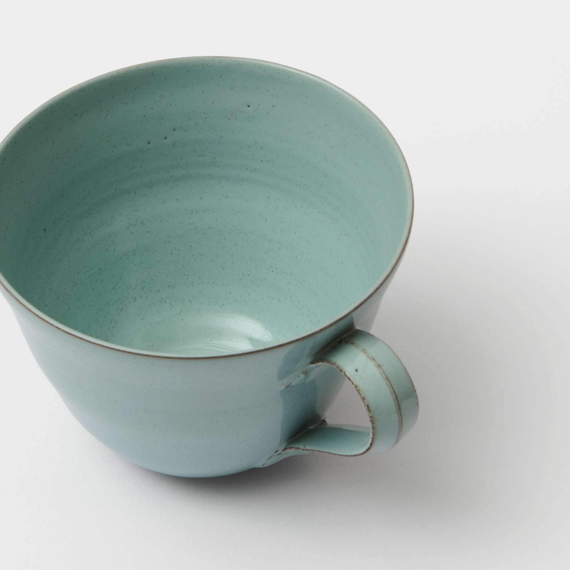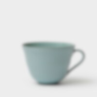 Teacup in high-fired earthenware with a dim turquoise glaze. Made by Annica Gjerstad in her pottery studio in Sweden. The cup has a diameter of approximately 12.5 cm and a height of approximately 9 cm. All measurements are approximate, as shape and size may vary slightly during the drying and firing process. Each cup therefore has its own unique character, and natural variations in glaze and surface occur. It is dishwasher and microwave safe. To preserve the glaze over time, a mild dishwasher detergent is recommended.