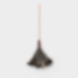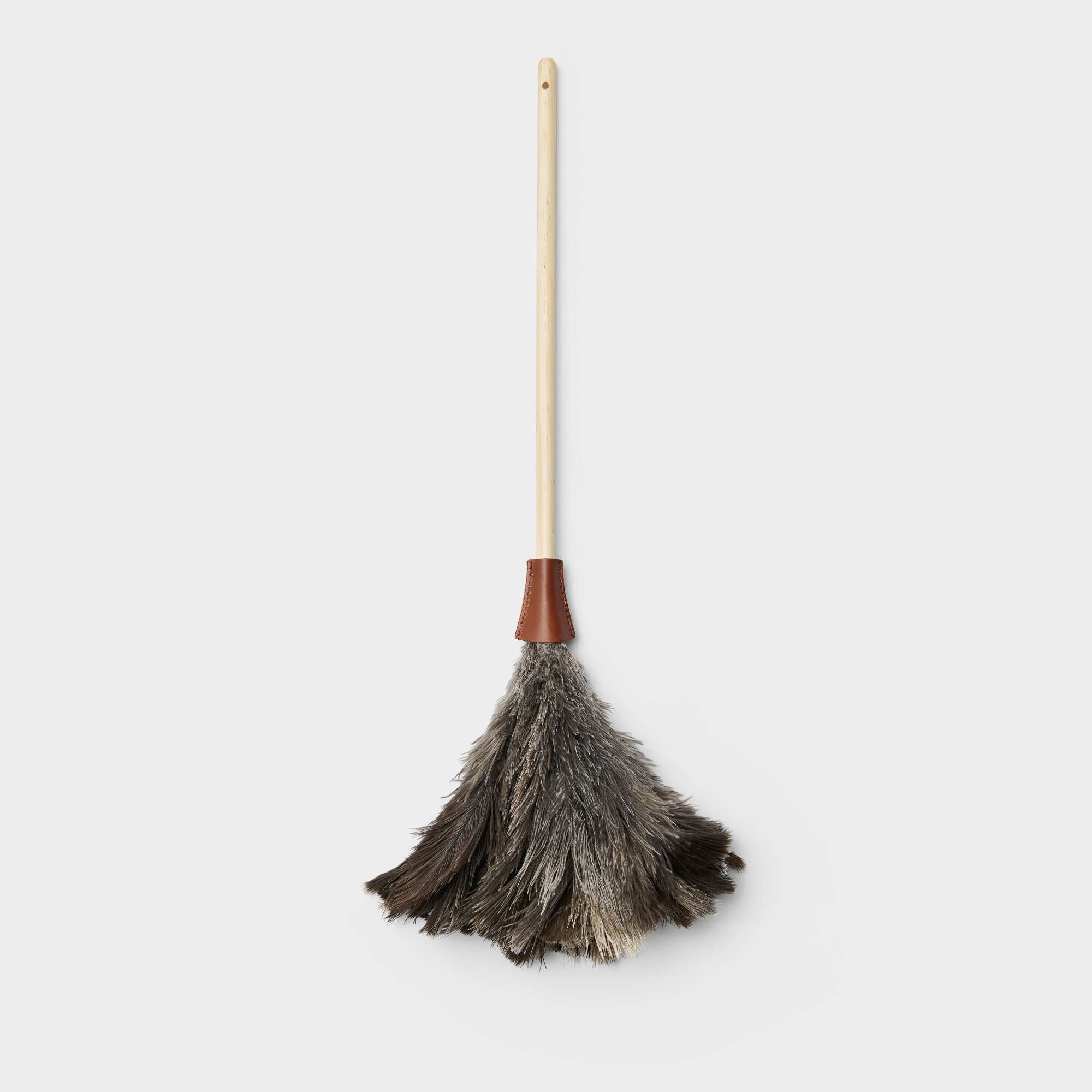 Feather duster with a wooden handle, leather detail at the top, and high-quality ostrich feathers. The feathers attract and hold dust, allowing for gentle and efficient cleaning.